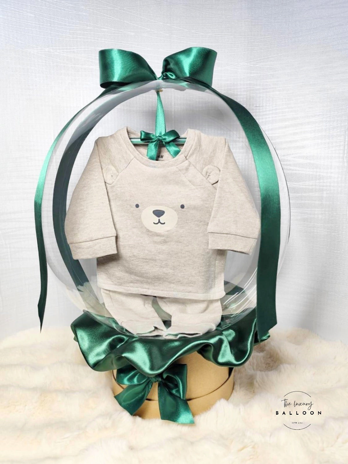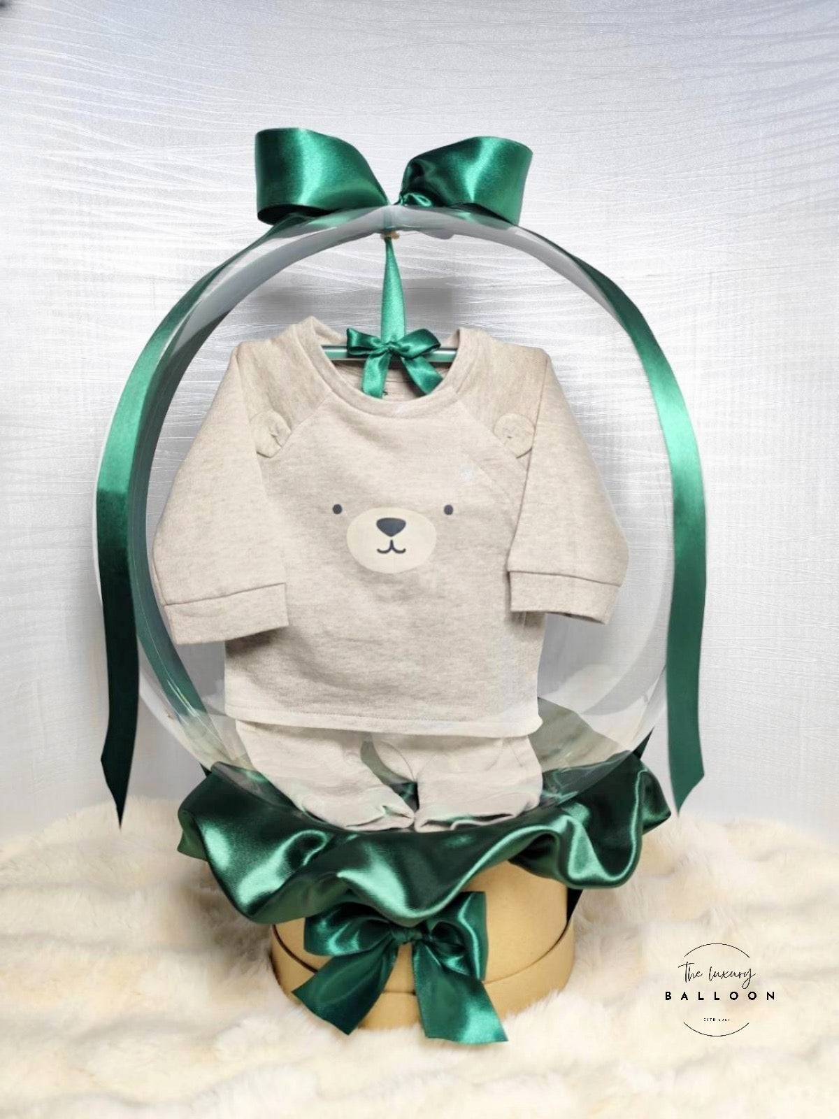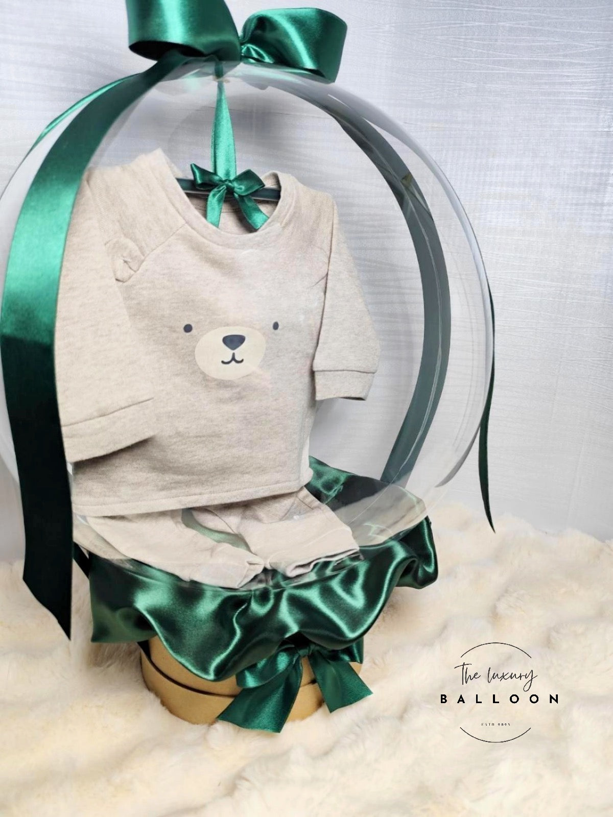 Το μπαλόνι, το ρουχαλάκι σε μπεζ του πούρου, η καπελιέρα craft, το σατέν ύφασμα της βάσης, οι σατέν κορδέλες forest green, το κόστος χειροποίητης κατασκευής και συσκευασίας, καθώς και ο ΦΠΑ 24%.